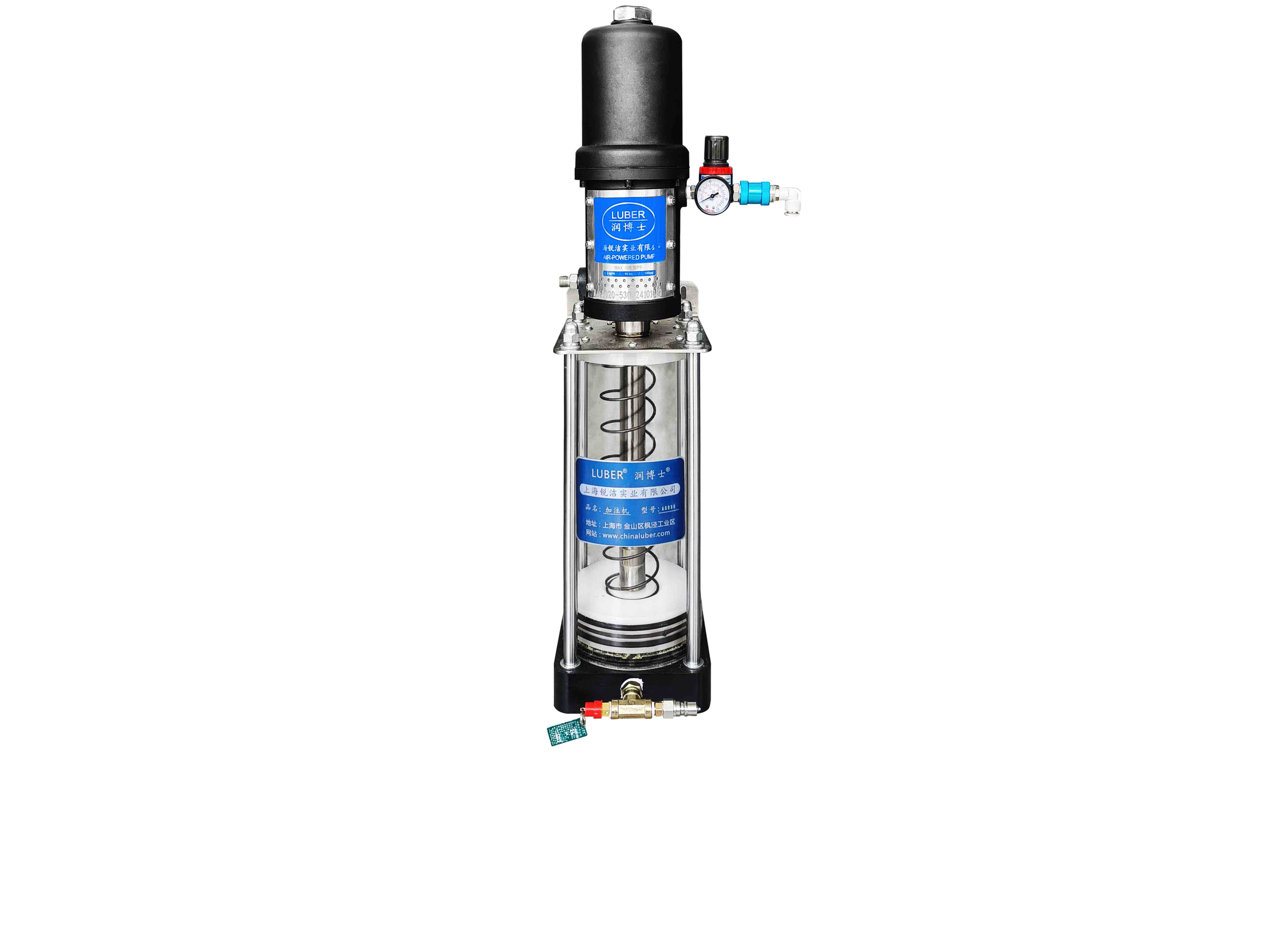 - 氣動(dòng)黃油注脂機(jī)是以壓縮空氣作動(dòng)力,利用柱塞往復(fù)運(yùn)動(dòng),從而輸出壓力潤(rùn)滑油脂的一種裝置。配置有預(yù)施壓裝置,輸出壓力高,具有結(jié)構(gòu)簡(jiǎn)單、使用維護(hù)方便、安全可靠、可降低勞動(dòng)強(qiáng)度、提高工作效率等特點(diǎn)。