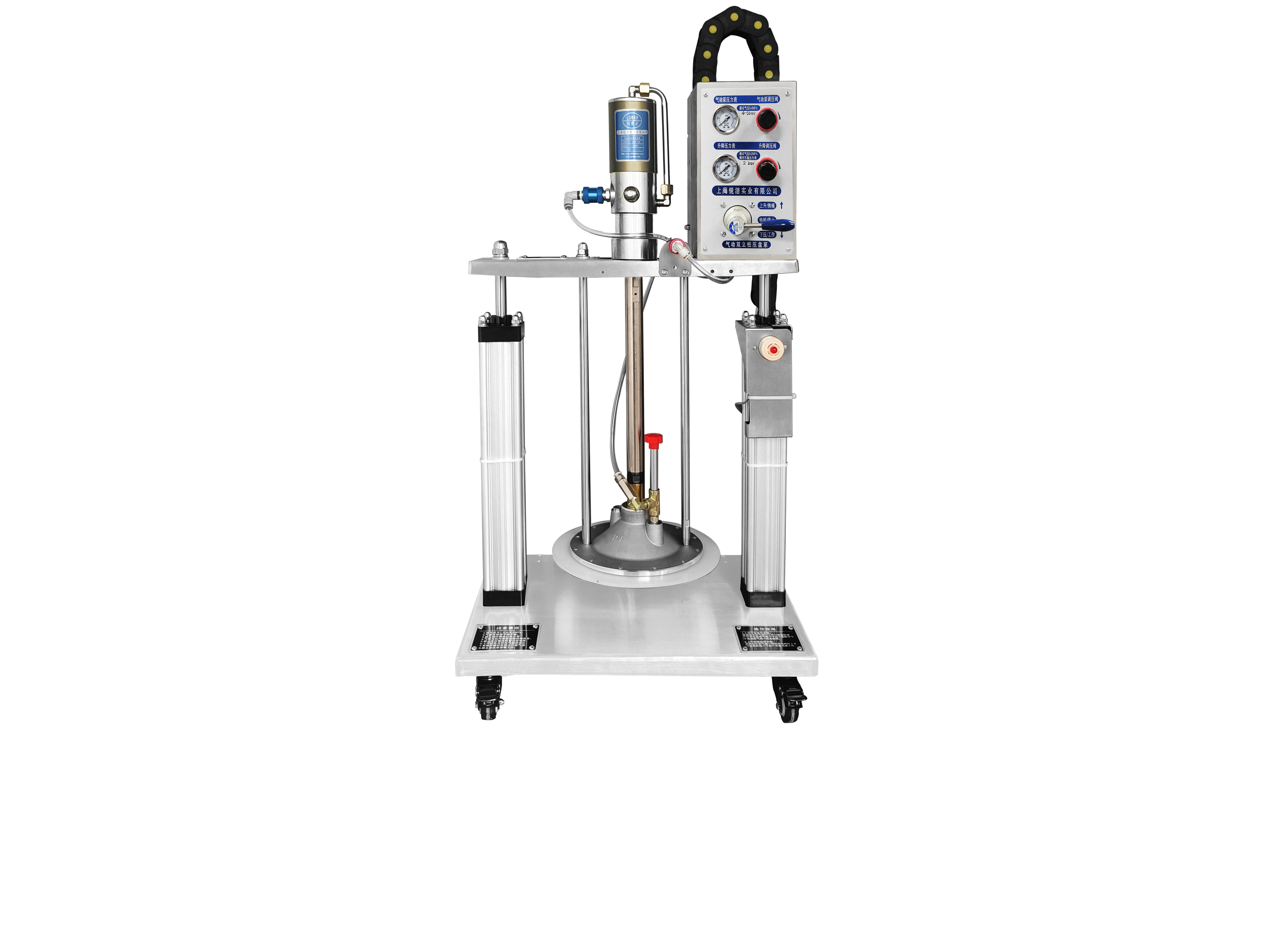 雙立柱黃油機是以壓縮空氣作動力,利用柱塞往復運動,從而輸出壓力潤滑油脂的一種裝置。配置有預施壓裝置,輸出壓力高,具有結構簡單、使用維護方便、安全可靠、可降低勞動強度、提高工作效率等特點,適合于有氣源場所油脂補充、以及生產線油脂輸送,應用于電子產品生產線,汽車零部件生產線、船用零件生產線、醫藥設備等各種行業產品所需的潤滑、粘合、灌注、密封等中、高粘度介(黃油、阻尼油、錫膏)的加注;使用雙氣缸輔助加壓,非常適用高粘度介質:低噪音、出油順暢、不間斷;吸膠吸脂干凈,桶壁不殘留;