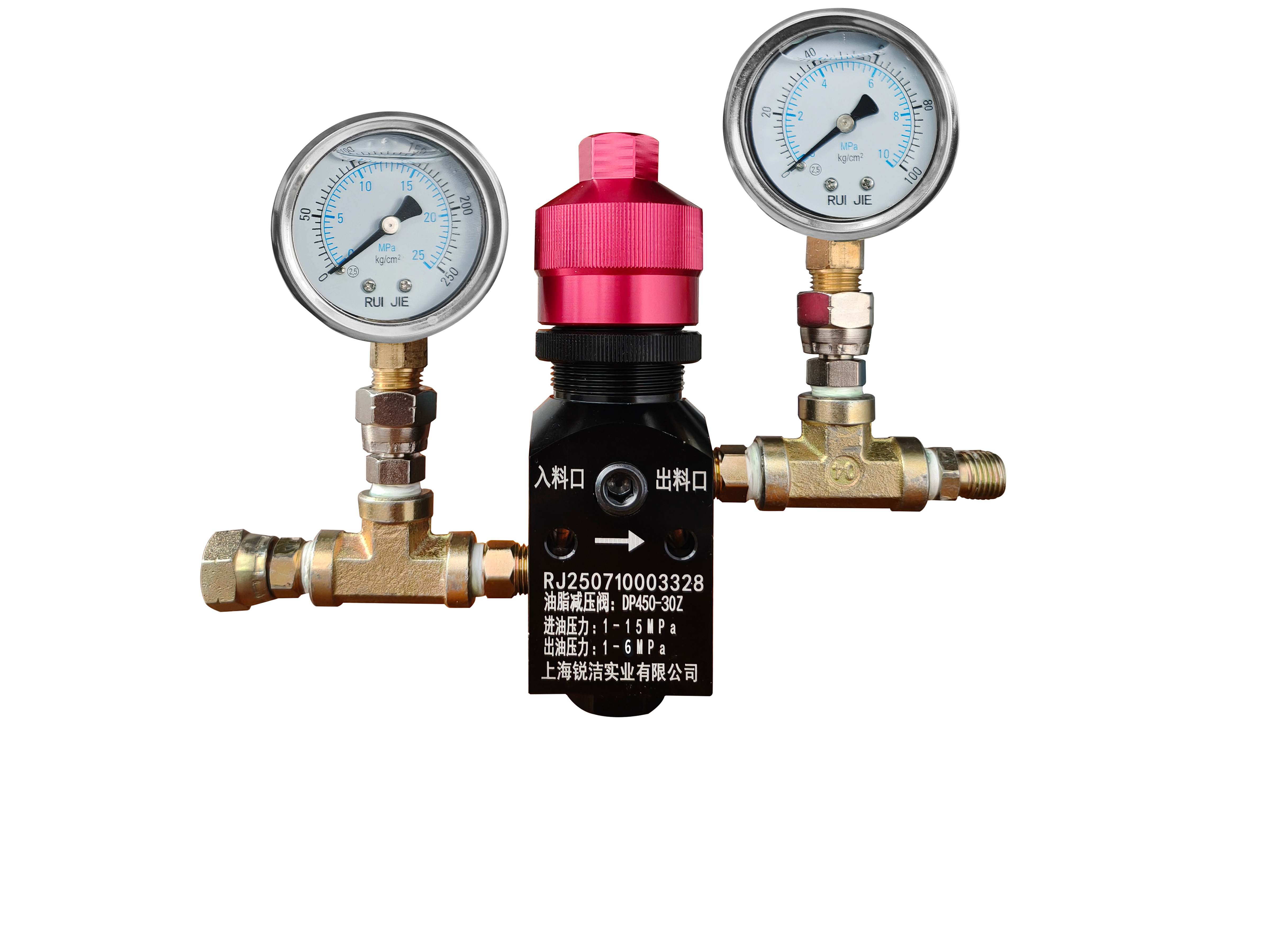 減壓閥可以將柱塞泵輸送的高壓油脂(10-40Mpa)減壓到定量閥點膠閥或者其它設(shè)備額定耐壓范圍內(nèi)(8-150kg),并消除部分脈沖從而保護(hù)定量閥點膠閥或者其它設(shè)備,延長使用壽命。